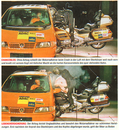 · vier Beschleunigungssensoren, die jeweils rechts und links an der Vorderradgabel sitzen und die die Aufprallverzögerung in Fahrtrichtung erkennen